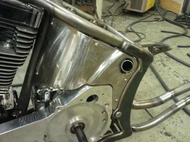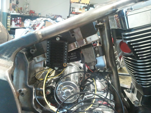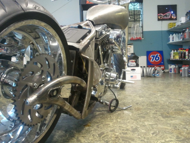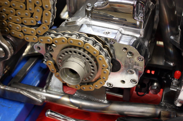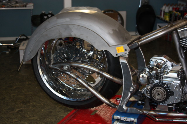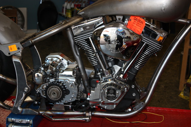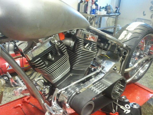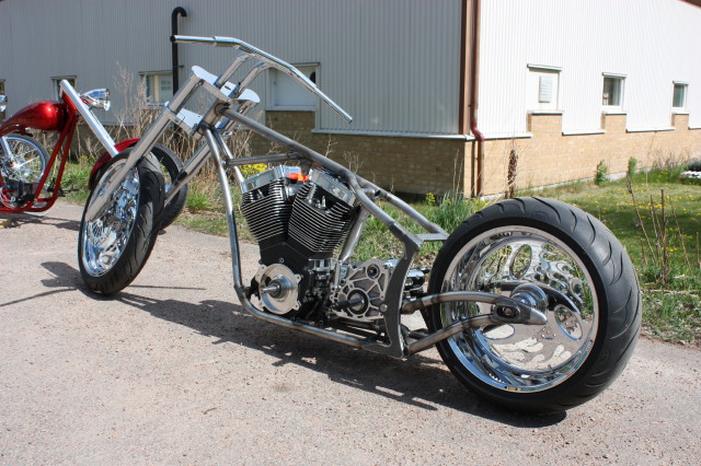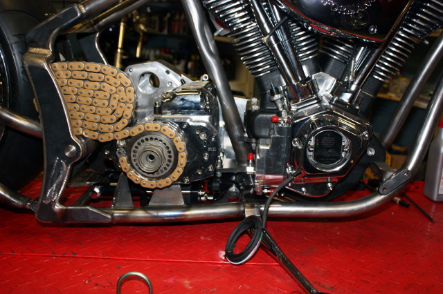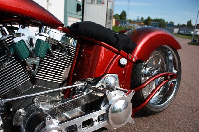 Softailram från PBM, Motorn är Ultimas största på 140 kubiktum dvs. ca:2.3 Liter och 165HK 220Newton, det kräver lite rejäla grejer i resten av drivlinan och vi har valt Zodiac's nya 6-växlade RSD Racelåda konverterad för kedjedrift. samt Ultimas dragbelt med yttre stödlager.