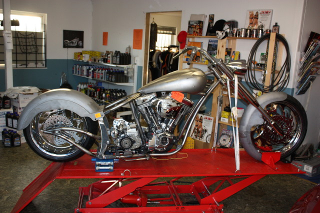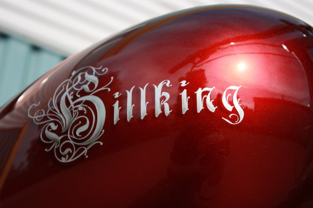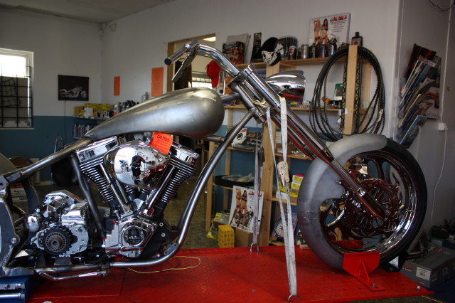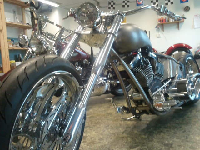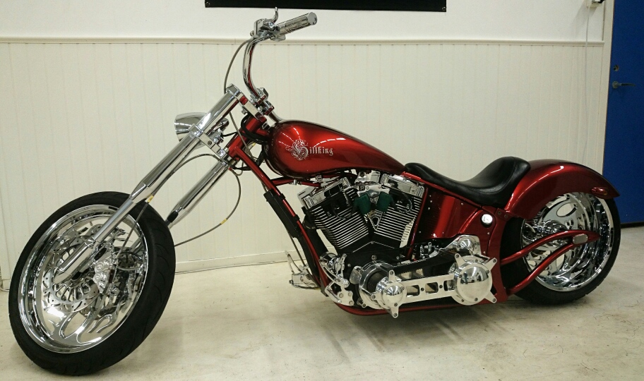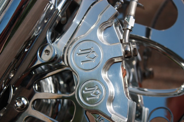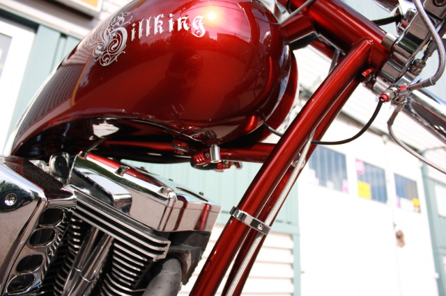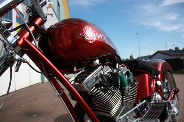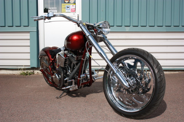 Skärmarna är Bellwether, Tanken kommer från en leverantör i USA. Framgaffeln är från Midwest och har dolda axelinfästningar och är för dubbla skivor, Styrkronorna är också med dolda bultar, de finns i både 0 och 5 grader och upp till 12 tum förlängt. Bakfjädringen är från Legends Air och kommer komplett med kompressor och allt som behövs för att konvertera till luftfjädring.