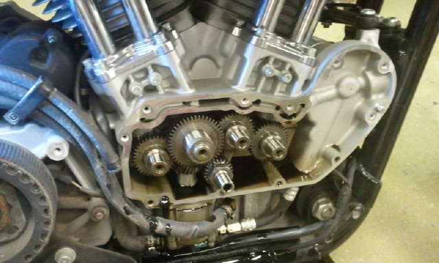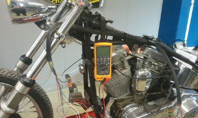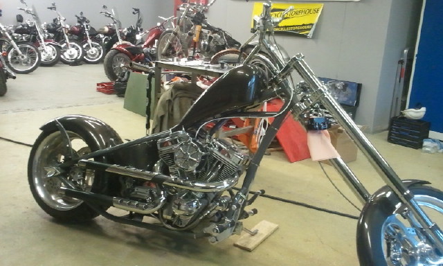 Kundchopper i verkstan för ombyggnad, Softailen får nytt elsystem.